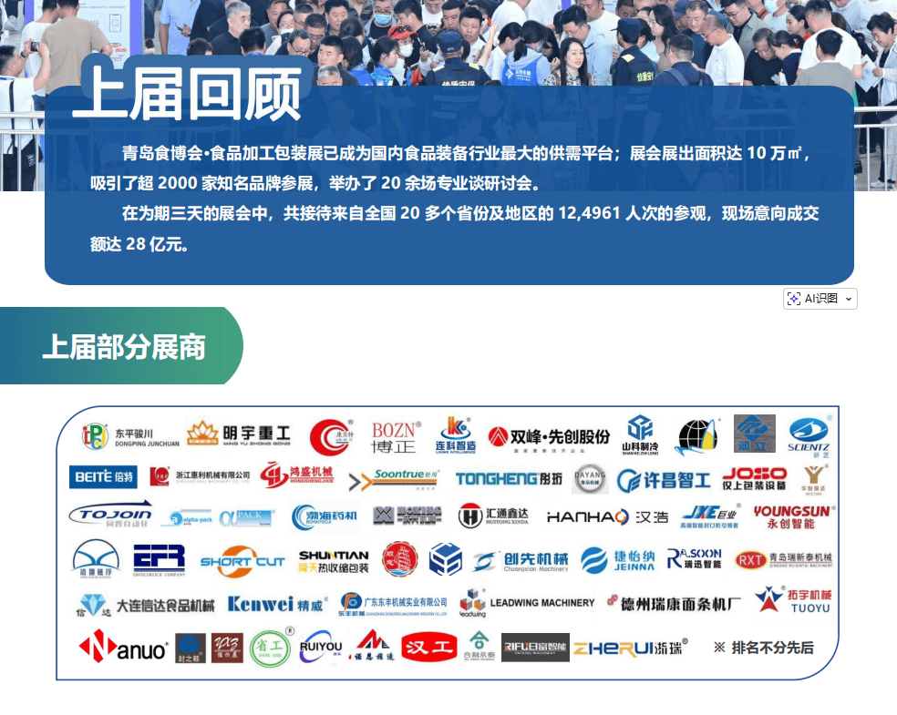 昌大举办。2026青岛食物机械展以“数智赋能食物财产,立异驱动包拆升级”为从题,汇聚全球食物加工取包拆机械范畴的最新手艺、设备及处理方案,是中国北方规模最大、影响力最强的食物机械行业嘉会。2026青岛食物机械展由食物工业协会结合从办,青岛蓝博国际会展无限公司承办,吸引2500+全球参展商,展出3000+项立异手艺及设备,涵盖食物加工、智能包拆、从动化出产线、冷链物流等全财产链处理方案。